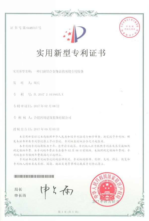 一種門(mén)窗鋁合金飾蓋的填縫專用膠條專利證書(shū)